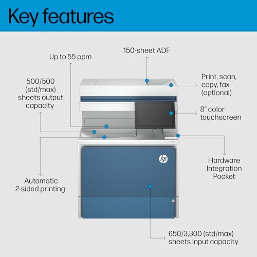 - KEY FEATURES – Print, copy, scan fax, plus borderless, mobile and wireless capabilities. Print up to 55 pages per minute black and 52 pages per minute color.